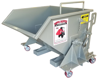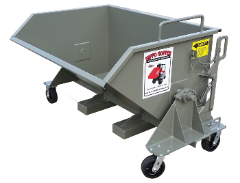 This hopper dumps to a full 90 degrees when attached to forklift. Along with our standard 1/2 and 1 cubic yard model custom sizes can be built to meet your specific application.